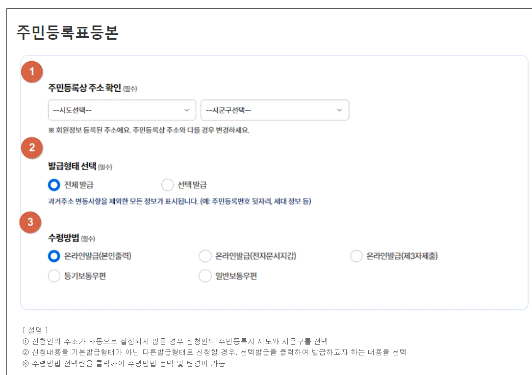 | 3 | 발급 신청 | 원하는 주민등록등본의 종류를 선택하고 필요한 정보(이름, 주민번호 등)를 입력합니다. |