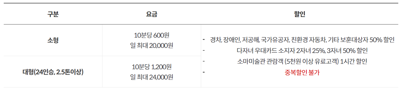 | 소형 차량 | 10분당 600원 | 경차, 장애인, 저공해, 국가유공자 등 50% 할인 |
