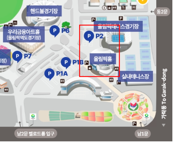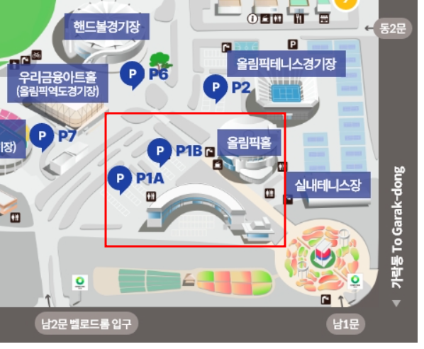 2. 두번째로 올림픽홀에서 가까운 주차장은 남2문으로 들어와서 이용가능한 P1 주차장입니다. 주차가능대수 규모가 올림픽 공원내에서 가장 큰 주차장이라 P1보다는 더욱 수월하게 주차할 수 있습니다.