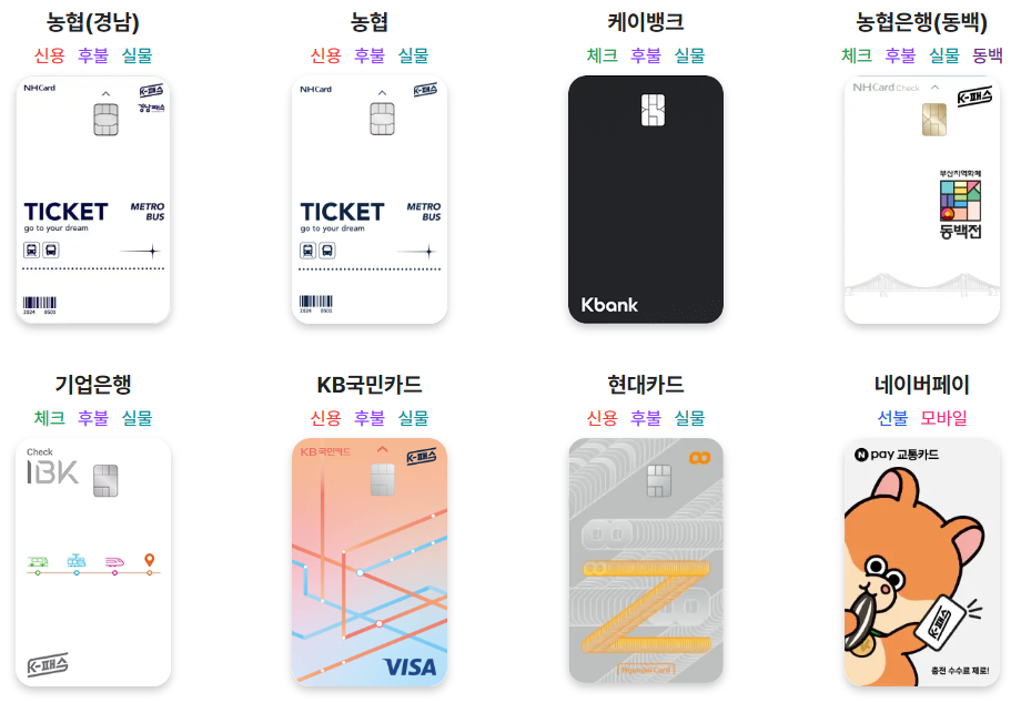 2025년 기준으로 총 43종의 K패스 카드가 존재하며, 신용카드/체크카드 모두 지원합니다.