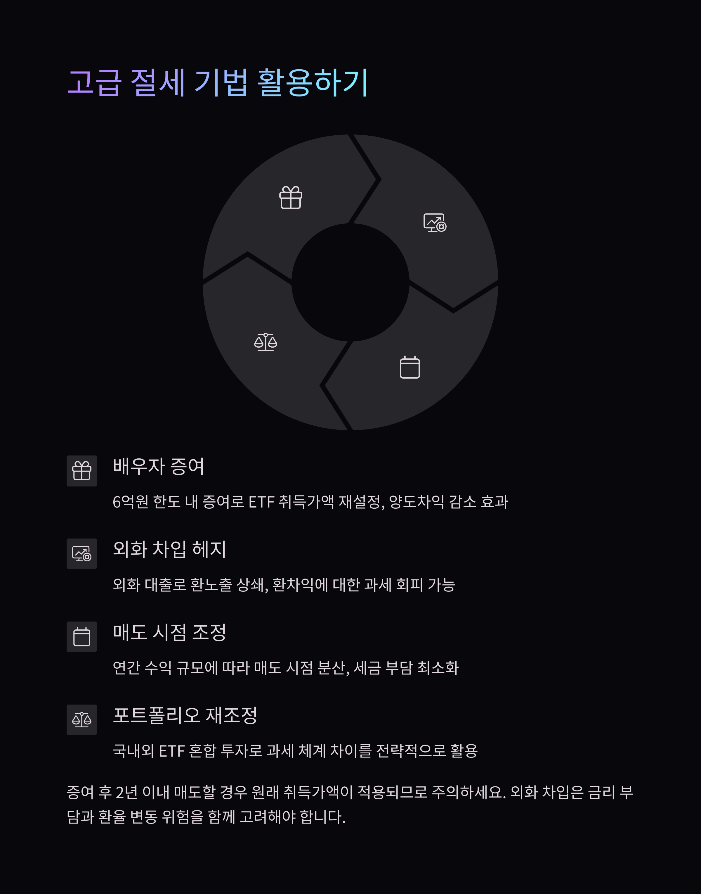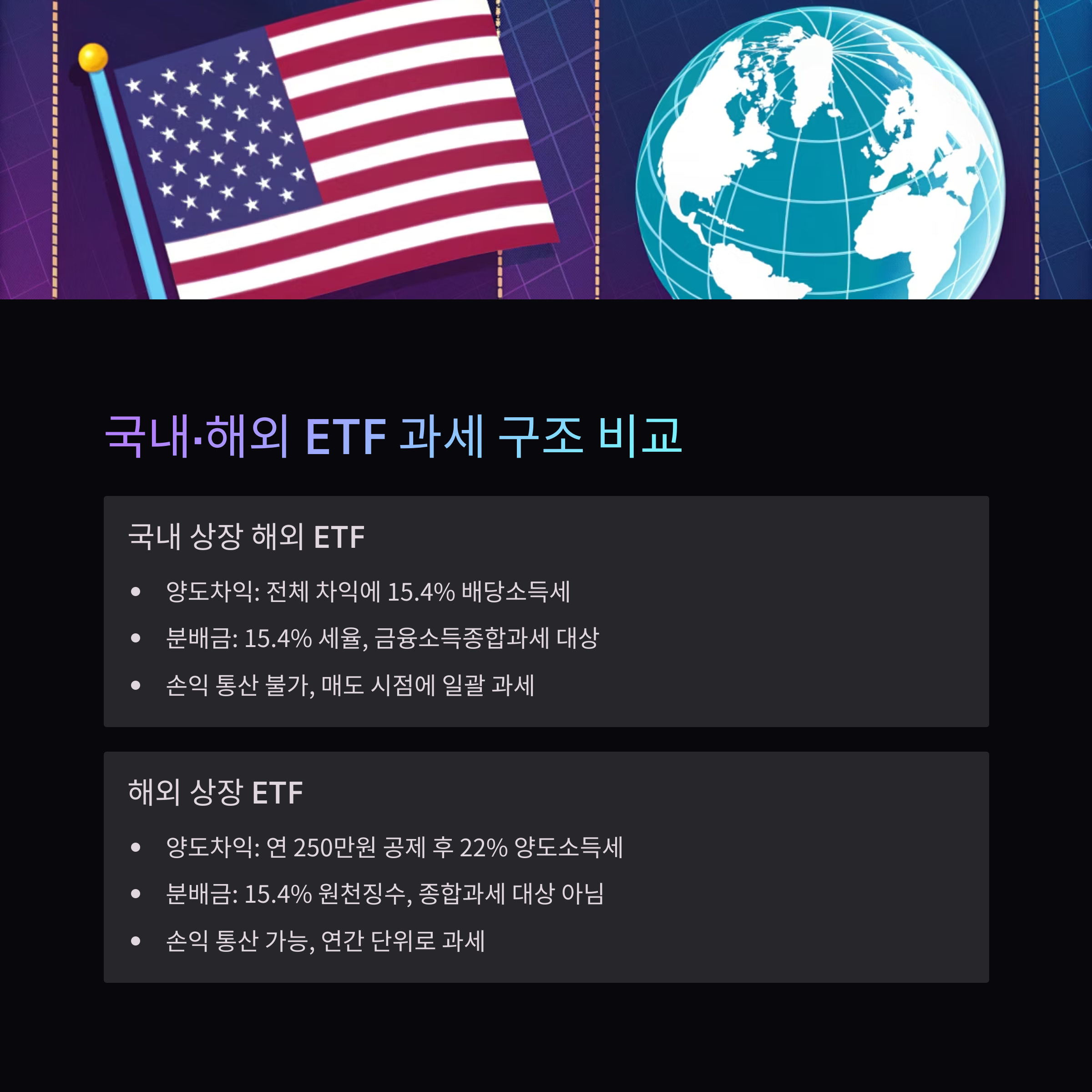 - 국내 ETF와 해외 ETF를 혼합 투자해 과세 체계 차이를 전략적으로 이용할 필요도 있습니다.
