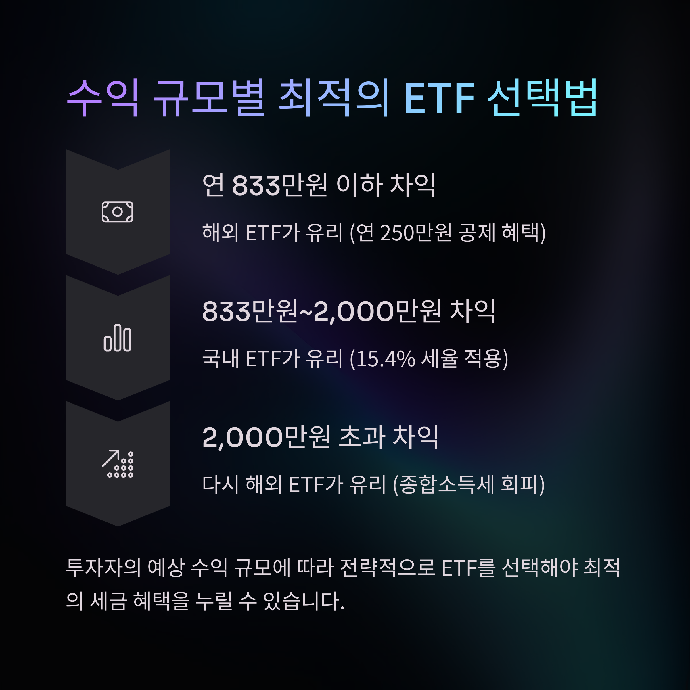 - 연 833만 원 이하 차익 → 해외 ETF 유리