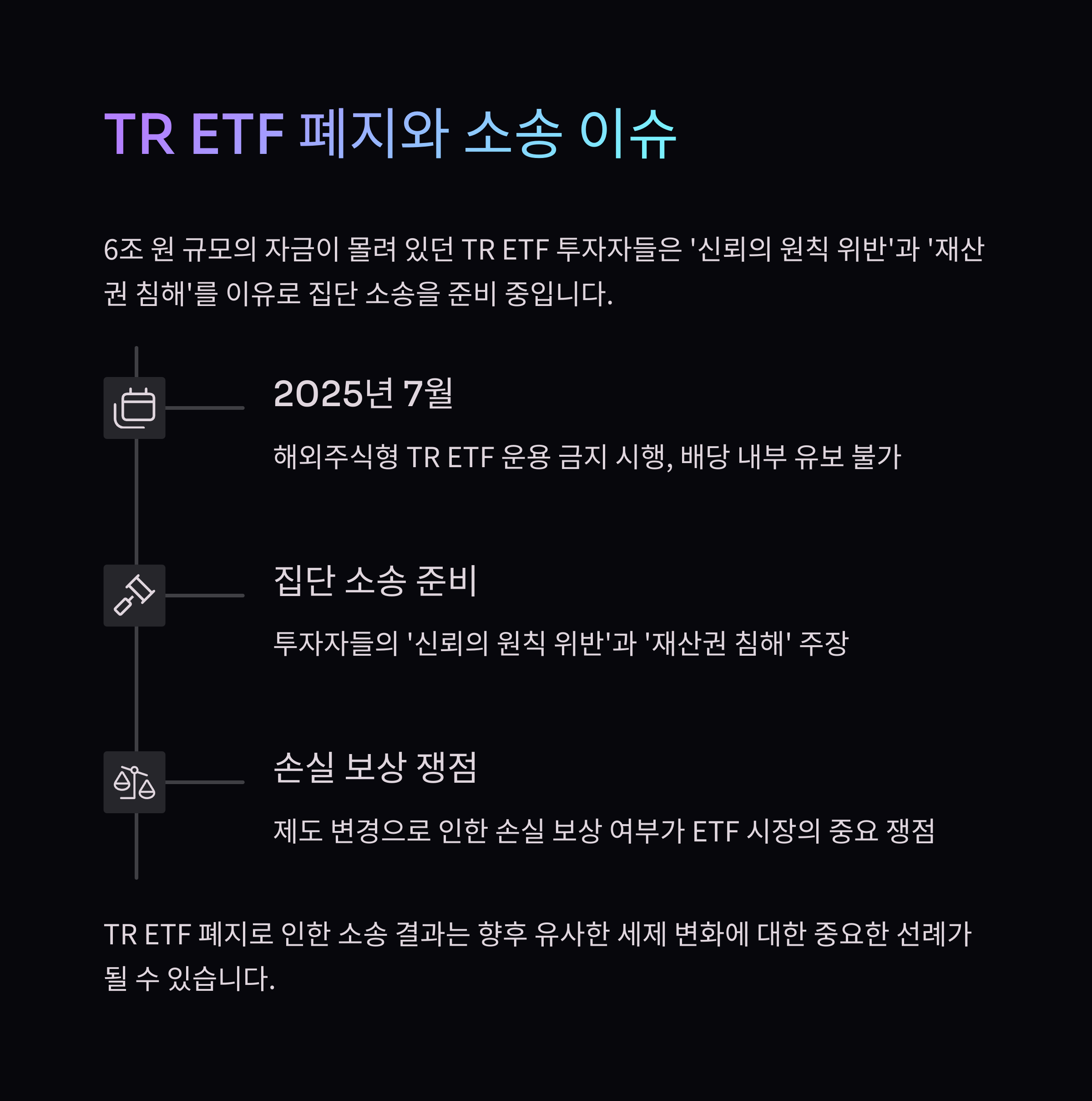 6조 원 규모의 자금이 몰려 있던 TR ETF 투자자들은 '신뢰의 원칙 위반'과 '재산권 침해'를 이유로 집단 소송을 준비 중입니다.