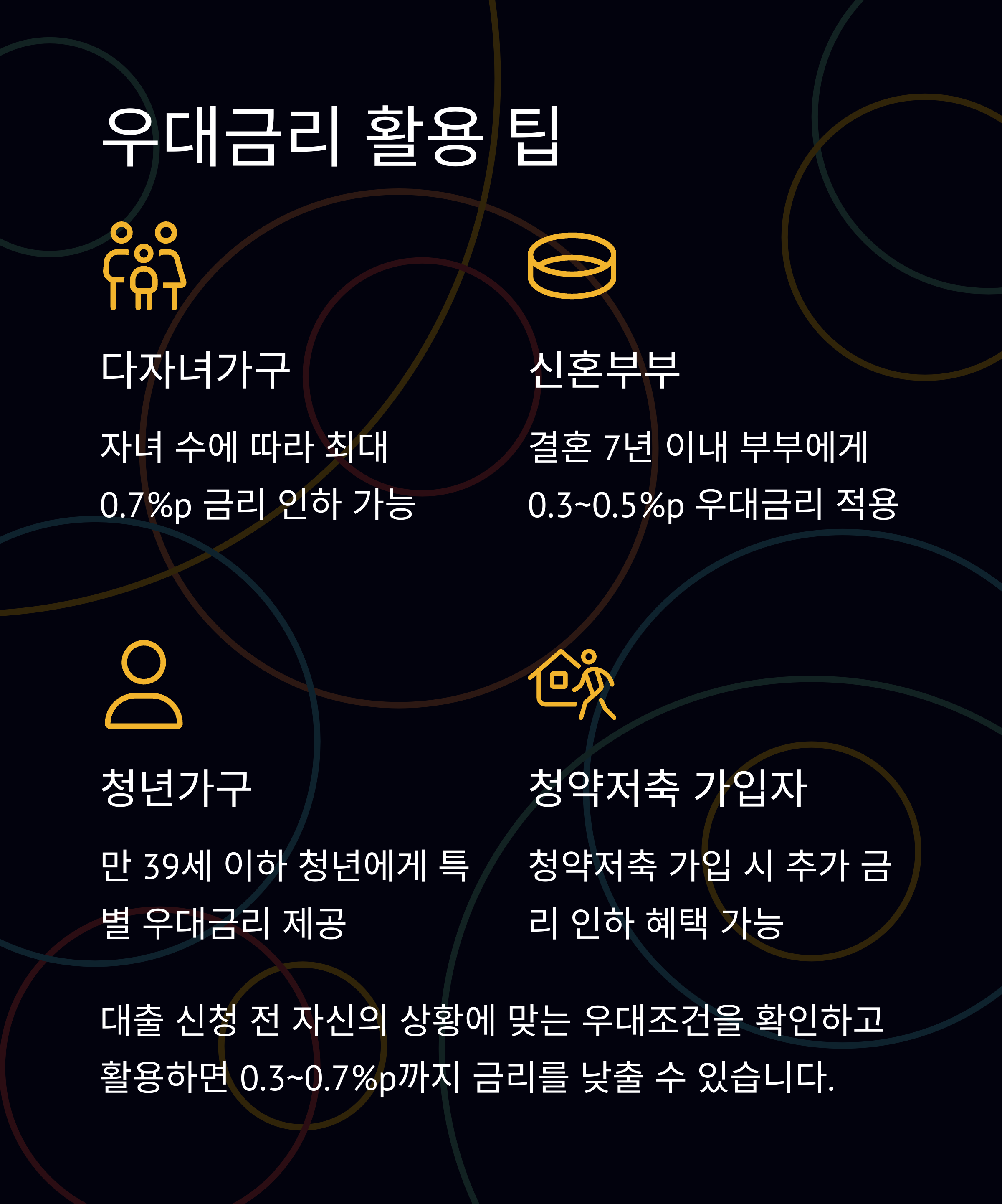 보금자리론을 이용할 경우 다자녀가구, 신혼부부, 청년가구 등은 다양한 우대금리 혜택을 받을 수 있습니다. 이를 통해 0.3~0.7%p까지 금리를 낮출 수 있으며, 청약저축 가입자의 경우에도 추가 금리 인하 혜택이 가능합니다. 반드시 대출 신청 전 자신의 상황에 맞는 우대조건을 확인하고 활용하세요.