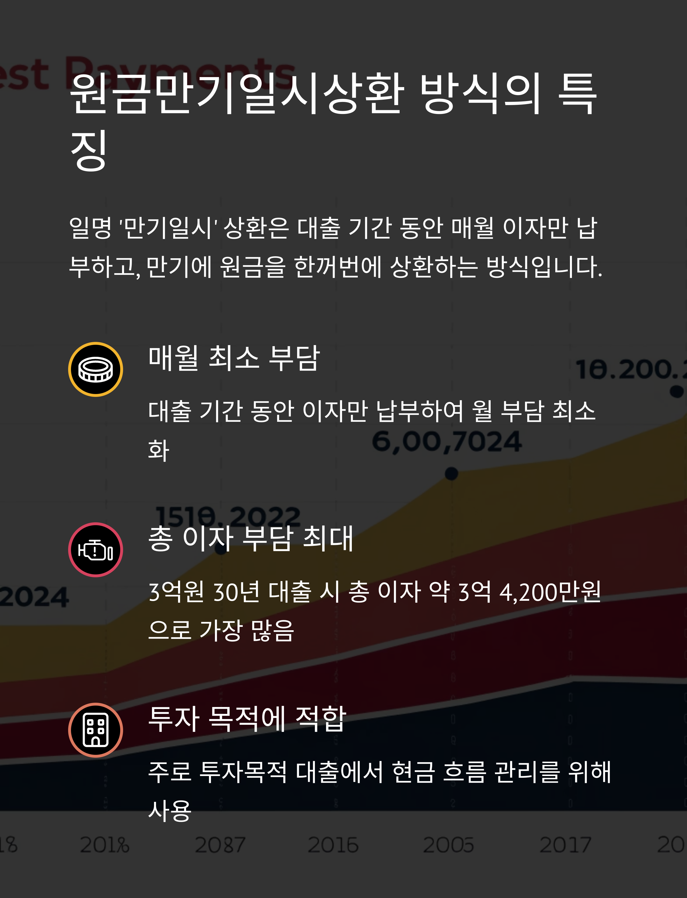 - 투자 목적으로 대출을 활용할 경우, 월 부담을 최소화하는 원금만기일시상환이 현금 흐름 관리에 유리할 수 있습니다.