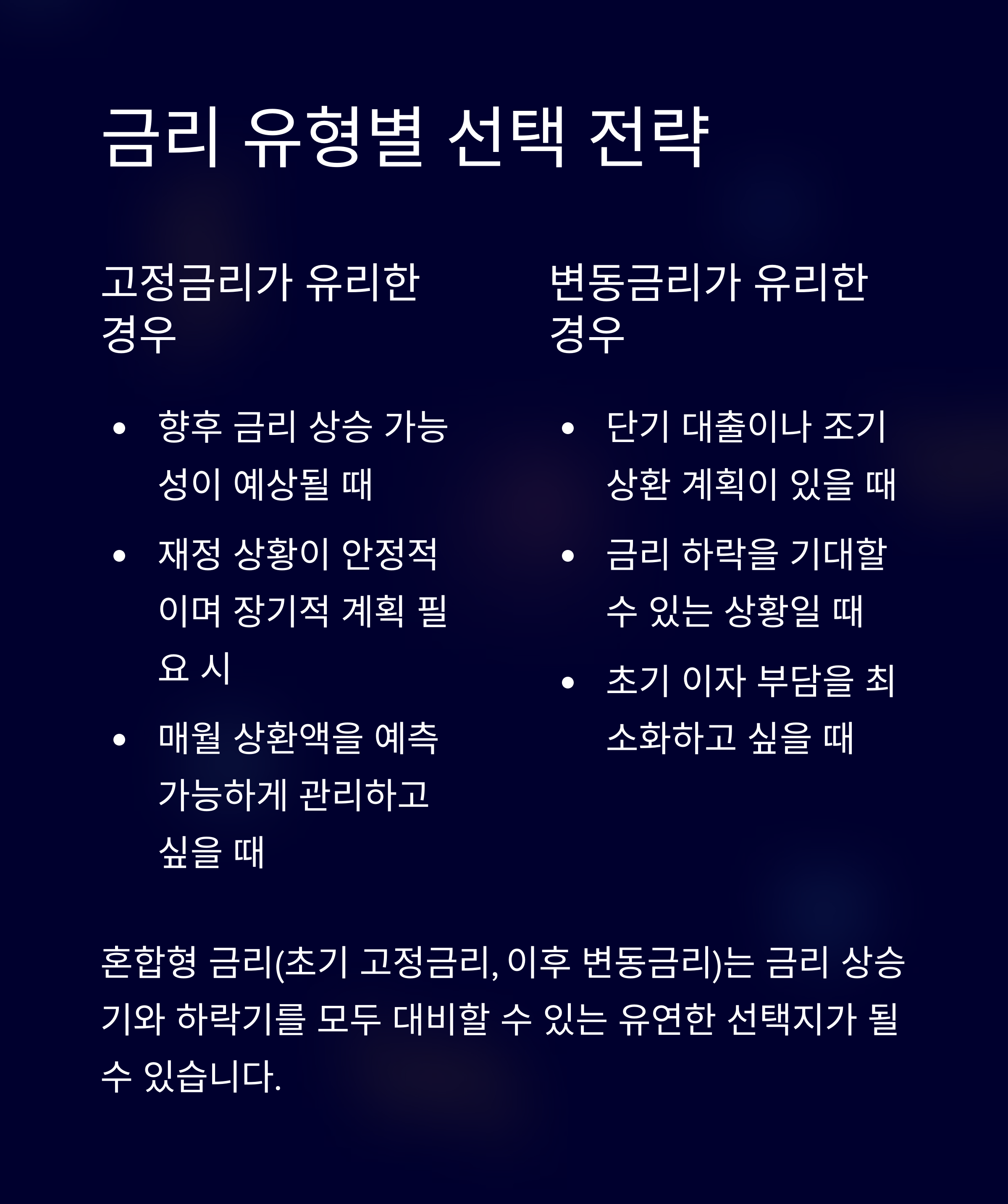 초기에는 고정금리, 이후 변동금리로 전환되는 혼합형 금리 상품도 있습니다. 이는 금리 상승기와 하락기를 모두 대비할 수 있는 유연한 선택지가 될 수 있습니다.