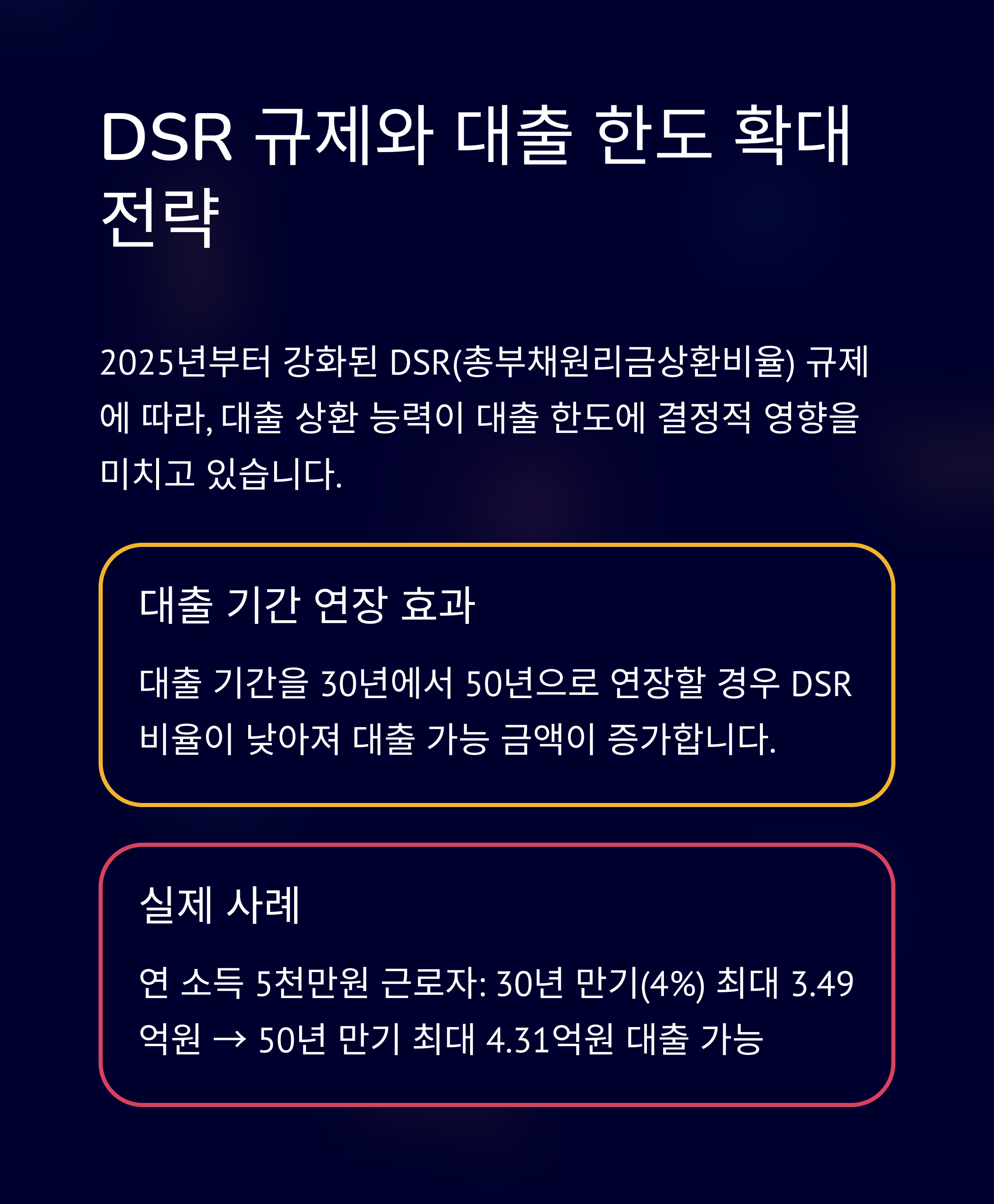 2025년부터 강화된 DSR(총부채원리금상환비율) 규제에 따라, 대출 상환 능력이 대출 한도에 결정적 영향을 미치고 있습니다. 대출 기간을 30년에서 50년으로 연장할 경우 DSR 비율이 낮아져 대출 가능 금액이 더 늘어날 수 있습니다.