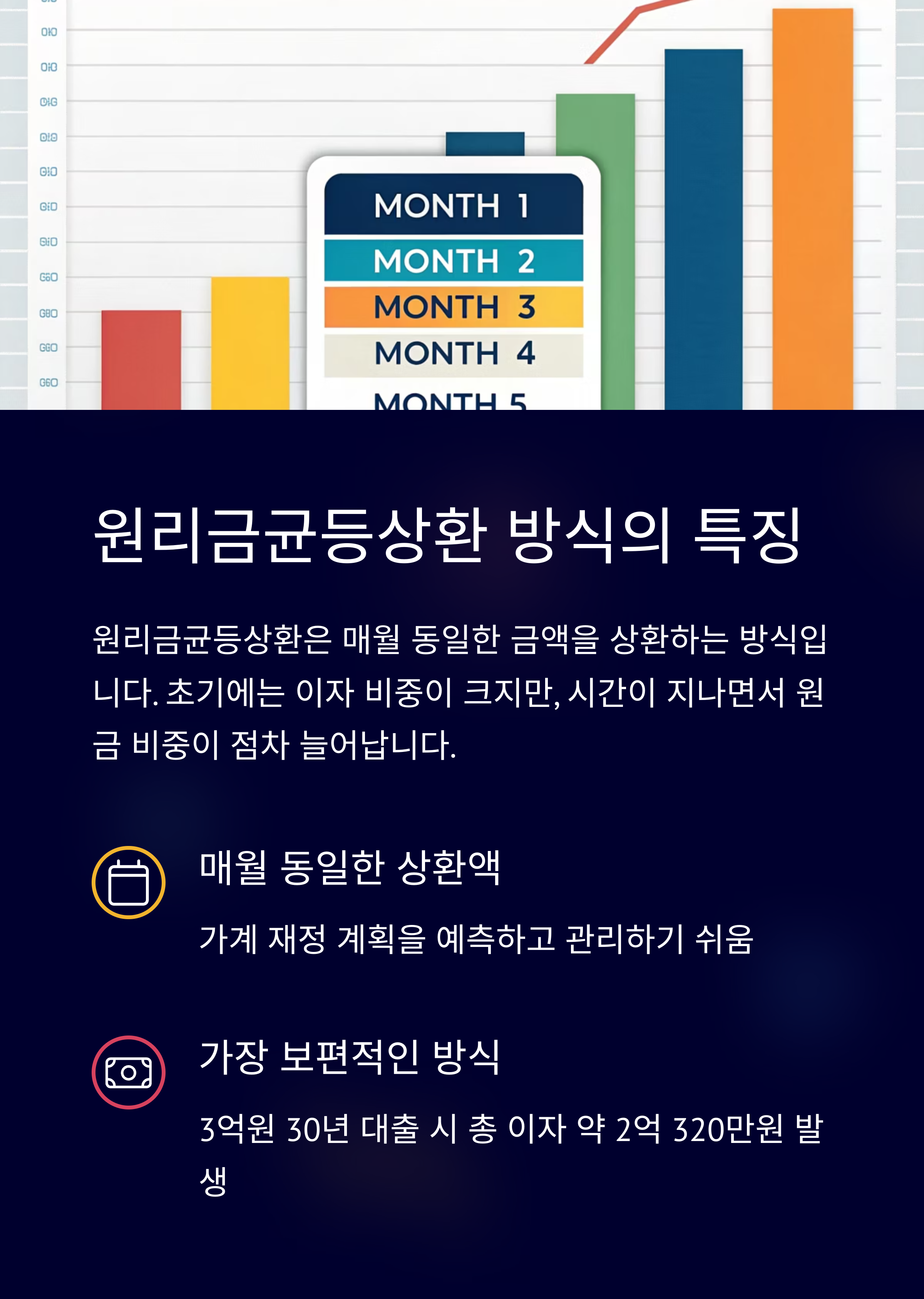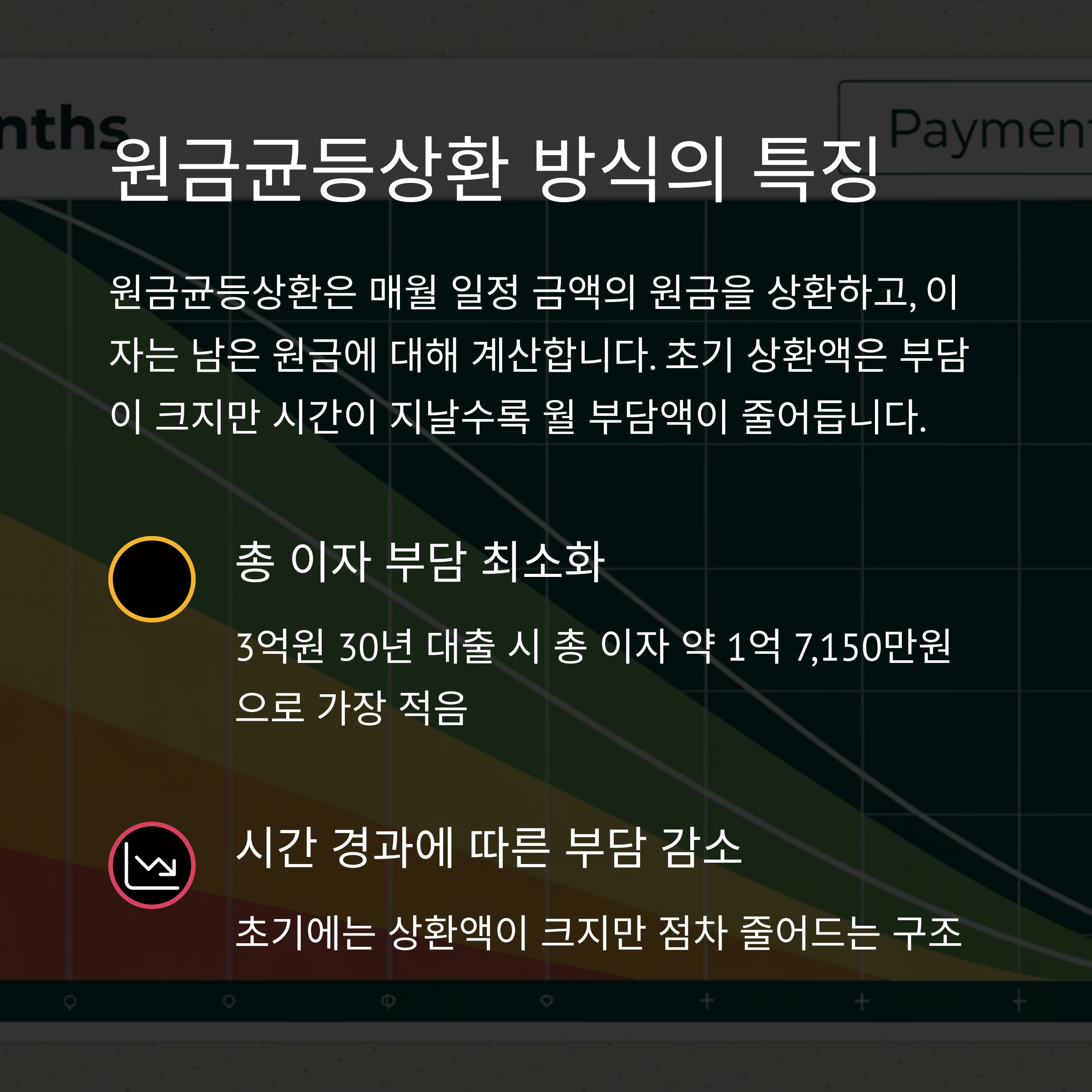 원금균등상환은 매월 일정 금액의 원금을 상환하고, 이자는 남은 원금에 대해 계산합니다. 초기 상환액은 부담이 크지만 시간이 지날수록 월 부담액이 줄어드는 장점이 있습니다. 장기적으로 보면 총 이자 부담이 가장 적습니다.