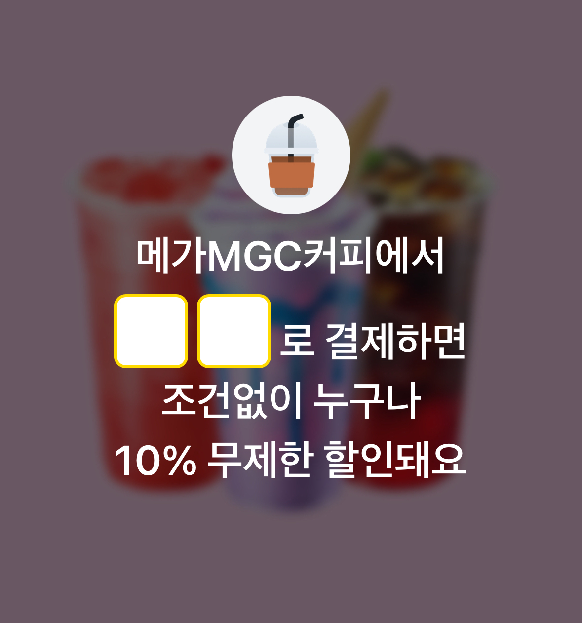 - 문제: 메가MGC커피에서 OO로 결제하면 조건 없이 누구나 10% 무제한 할인돼요